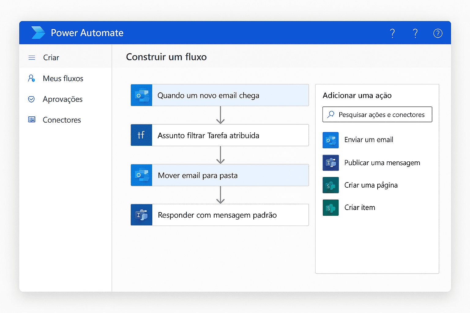 Para lidar com um grande volume de e-mails, imagine que todo início de mês, um setor de vendas recebe dezenas de mensagens com relatórios de diferentes áreas. Para manter a organização, os profissionais envolvidos precisam arquivar cada mensagem e enviar uma resposta padrão confirmando o recebimento. O Power Automate pode identificar os e-mails com base no assunto, arquivá-los na pasta correta e enviar automaticamente a resposta, liberando o tempo de cada profissional para tarefas mais estratégicas, como a análise detalhada dos relatórios.