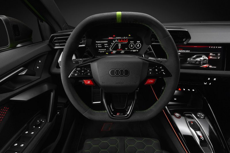 Por dentro, o modelo combina acabamento em microfibra Dinamica® e couro artificial, bancos esportivos RS (Sedan) ou bancos do tipo concha com acabamento em microfibra Dinamica e costura contrastante preta, vermelha ou verde(Track)e volante multifuncional RS de base e topo achatados. O painel recebe o Audi Virtual Cockpit Plus de 12,3”, com layouts exclusivos RS, incluindo indicadores de potência, torque, forças G, tempos de volta e shift light em estilo de competição. O sistema multimídia MMI Navigation Plus com tela touch de 10,1” é compatível com Android Auto e Apple CarPlay, e o som fica a cargo do sistema premium SONOS 3D de 680W.