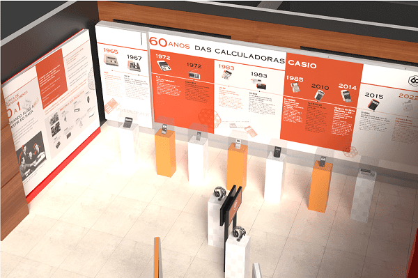 A exposição apresenta uma linha do tempo visual com imagens e marcos históricos de modelos icônicos da Casio, começando pela calculadora 001. Considerada um divisor de águas na história do cálculo eletrônico, ela foi o ponto de partida para inovações que viriam, como: