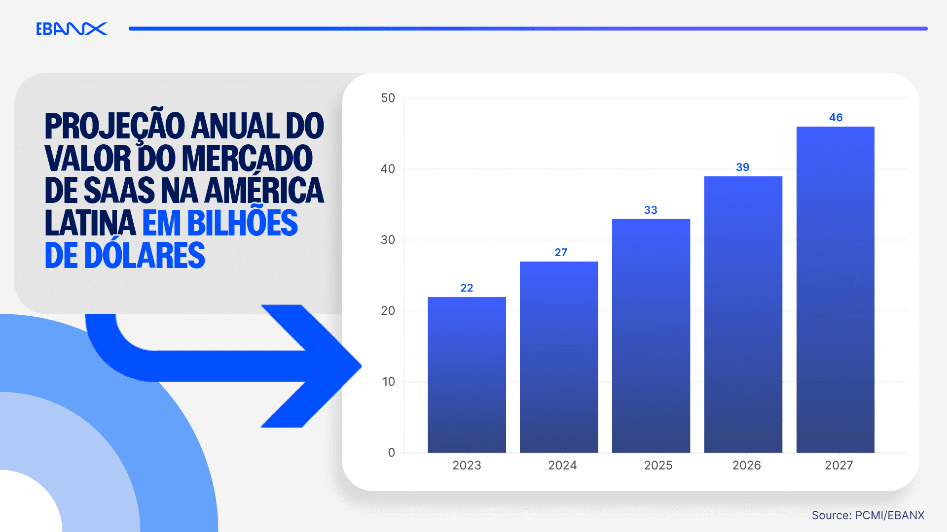 Dados exclusivos revelados hoje pelo EBANX, empresa global de tecnologia especializada em serviços de pagamento para mercados emergentes, mostram que o mercado de Software como Serviço (SaaS) da América Latina vai dobrar de tamanho até 2027. Em ritmo de crescimento acelerado, o valor movimentado pelo setor vai saltar de USD 22 bilhões em 2023 para USD 46 bilhões daqui a dois anos, segundo dados do instituto de pesquisa Payments and Commerce Market Intelligence analisados pelo EBANX.